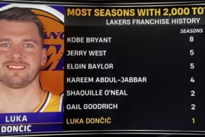 东契奇29投11中,三分球13中3,8罚7中得到32分7板6助3断。算上这32分,他赛季总得分2005分,是湖人队史第七位单赛季得分突破2000的球员。