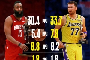 东契奇本赛季场均33.7分7.8篮板8.2助攻1.6抢断,投篮命中率48%,三分命中率37%