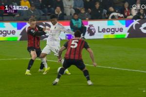 比赛的第67分钟,阿玛德禁区与特吕费尔对抗后倒地,裁判没有表示,VAR维持判罚。随后伯恩茅斯就地反击将比分扳平。